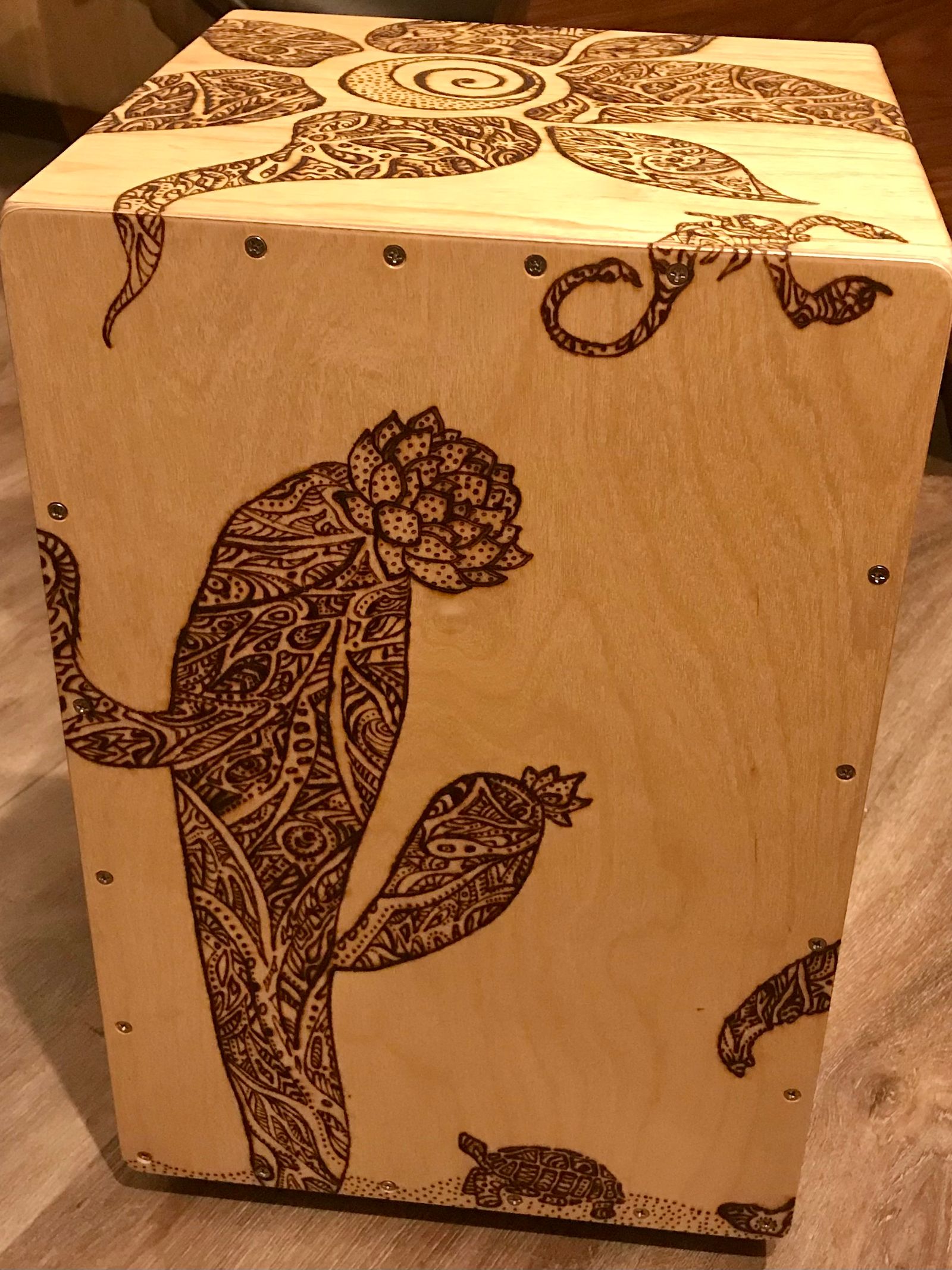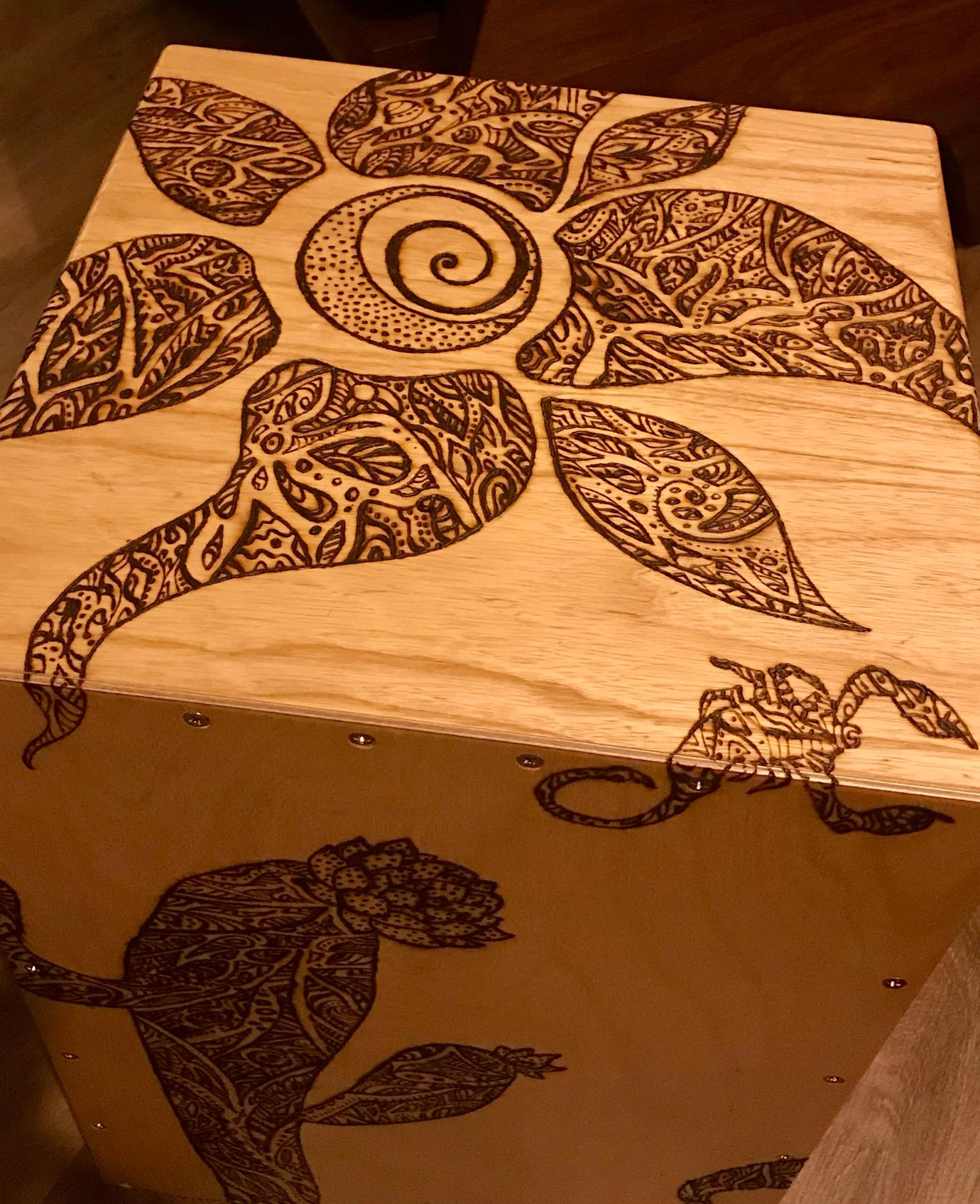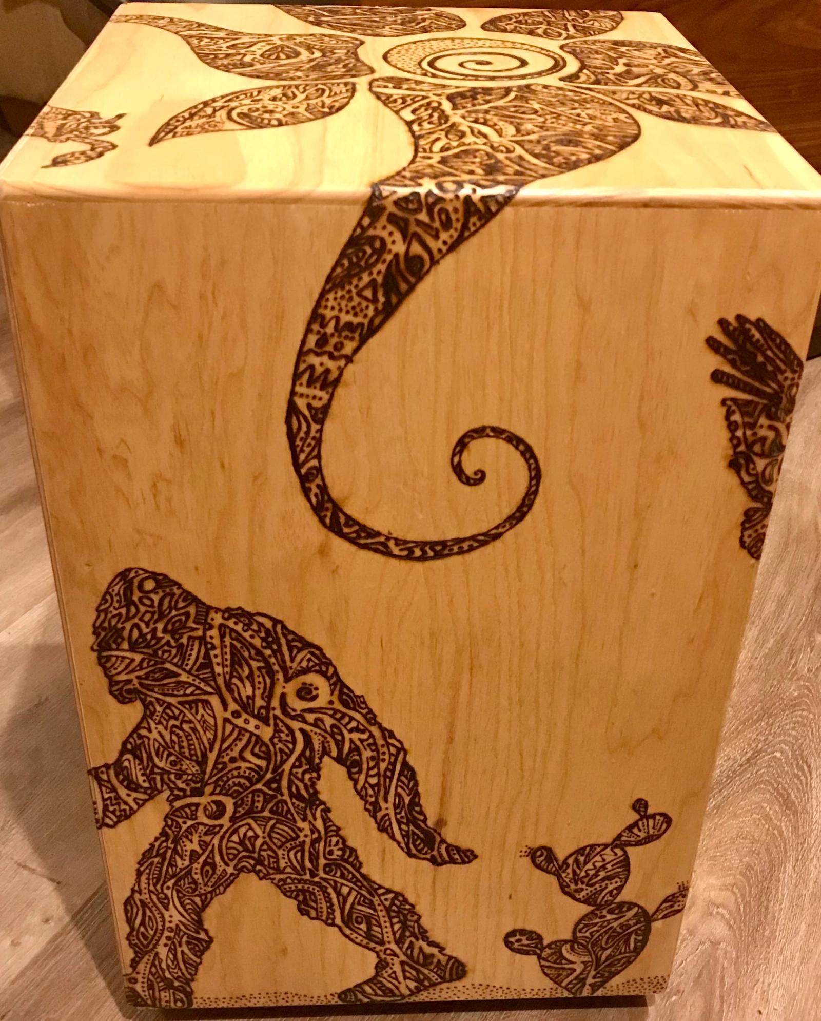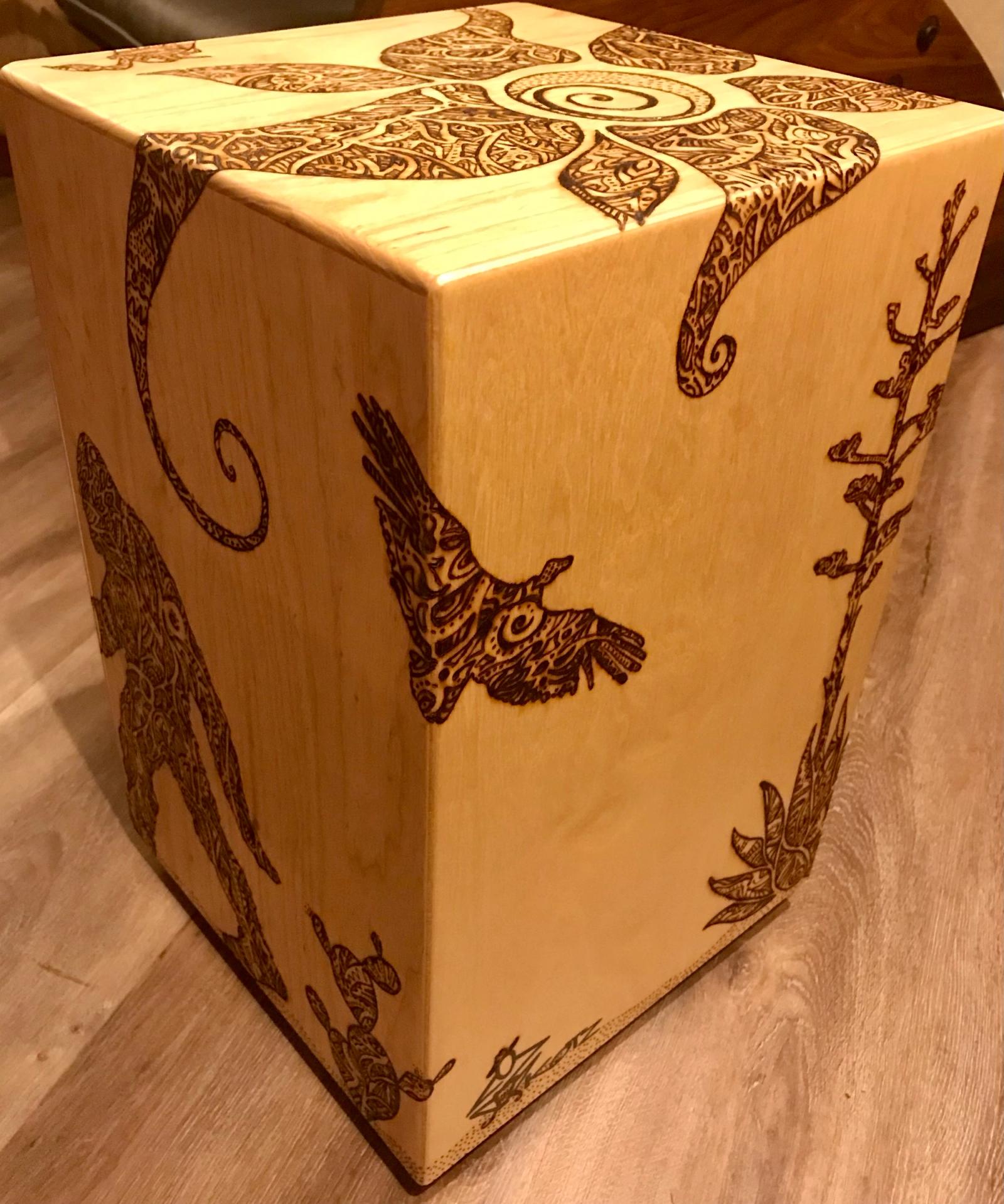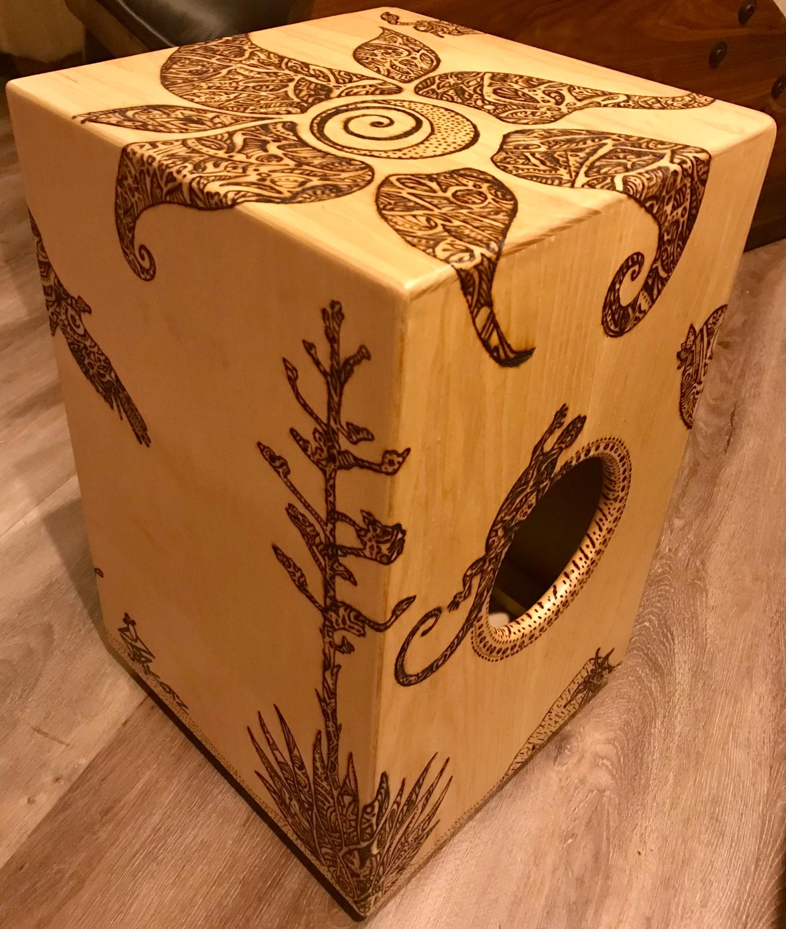 This cajón, titled Bigfoot in the Desert, is a collaboration with Lizz Redd, a versatile artist skilled in glassblowing, woodworking, and more. When Lizz asked if I’d ever tried woodburning a design onto my instruments—something I hadn’t explored—she offered to create one using a DIY tool her mother crafted from an automobile battery charger. Her playful concept of Bigfoot roaming the desert spans all six sides, with bold, graphic lines that wrap around the corners. I love both the whimsical feel and her distinctive style. After she finished, we made a second for her, making it a delight to each have one in our collections.