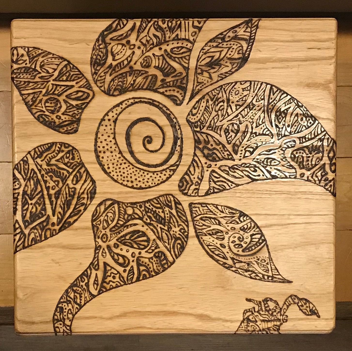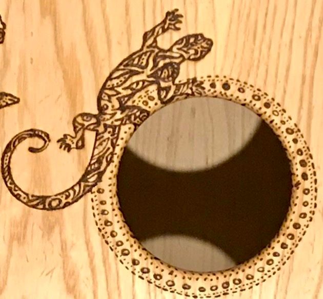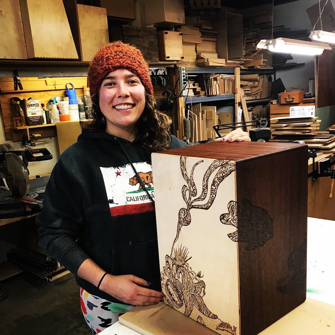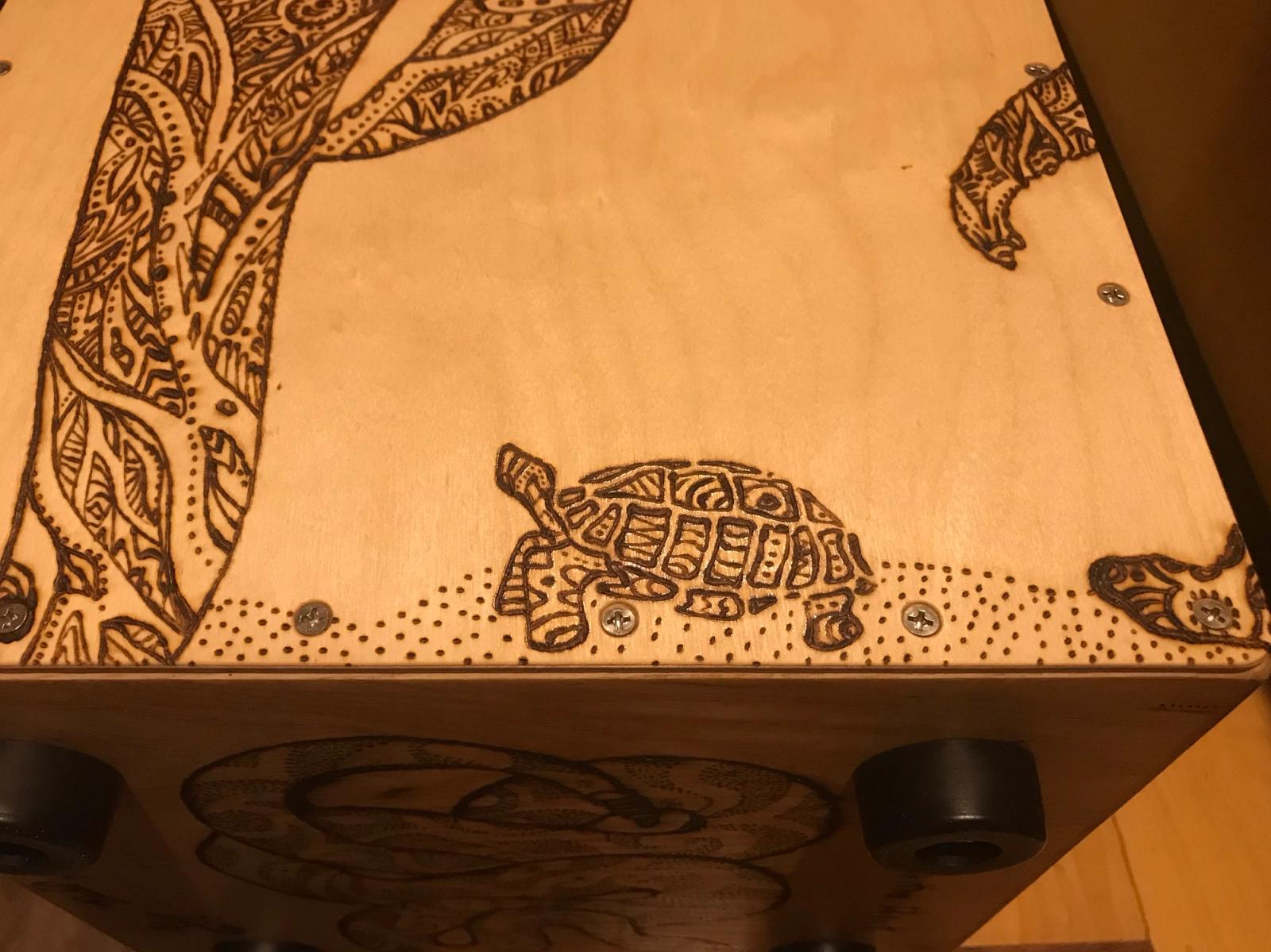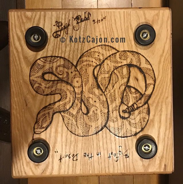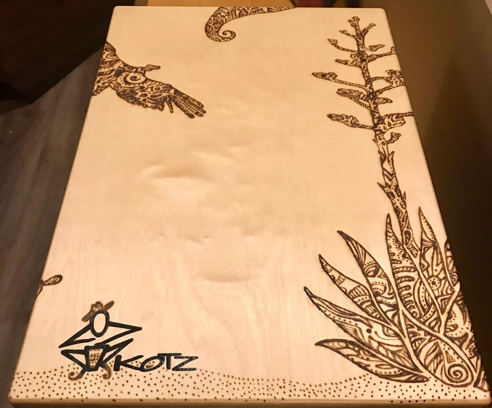 This cajón, titled Bigfoot in the Desert, is a collaboration with Lizz Redd, a versatile artist skilled in glassblowing, woodworking, and more. When Lizz asked if I’d ever tried woodburning a design onto my instruments—something I hadn’t explored—she offered to create one using a DIY tool her mother crafted from an automobile battery charger. Her playful concept of Bigfoot roaming the desert spans all six sides, with bold, graphic lines that wrap around the corners. I love both the whimsical feel and her distinctive style. After she finished, we made a second for her, making it a delight to each have one in our collections.