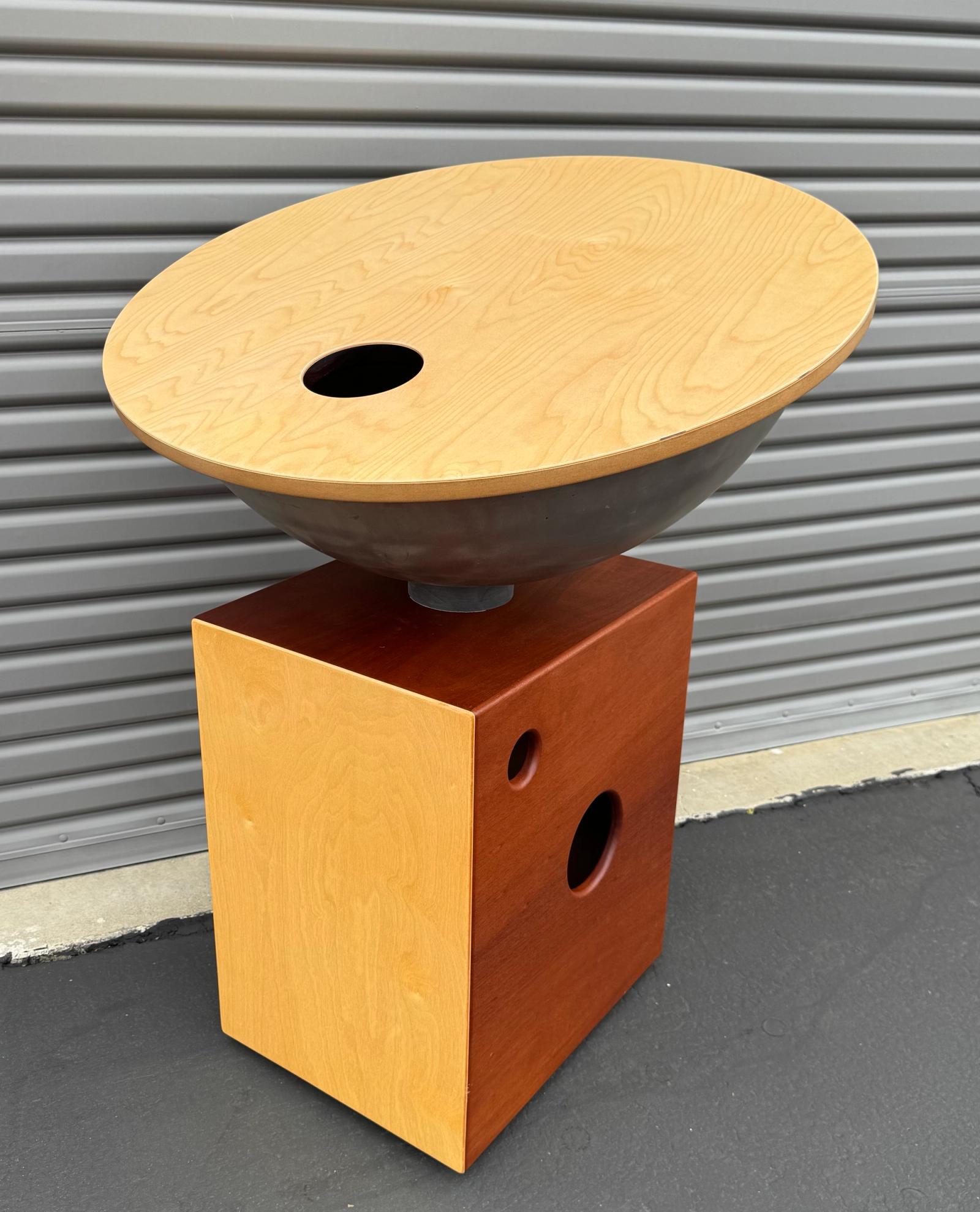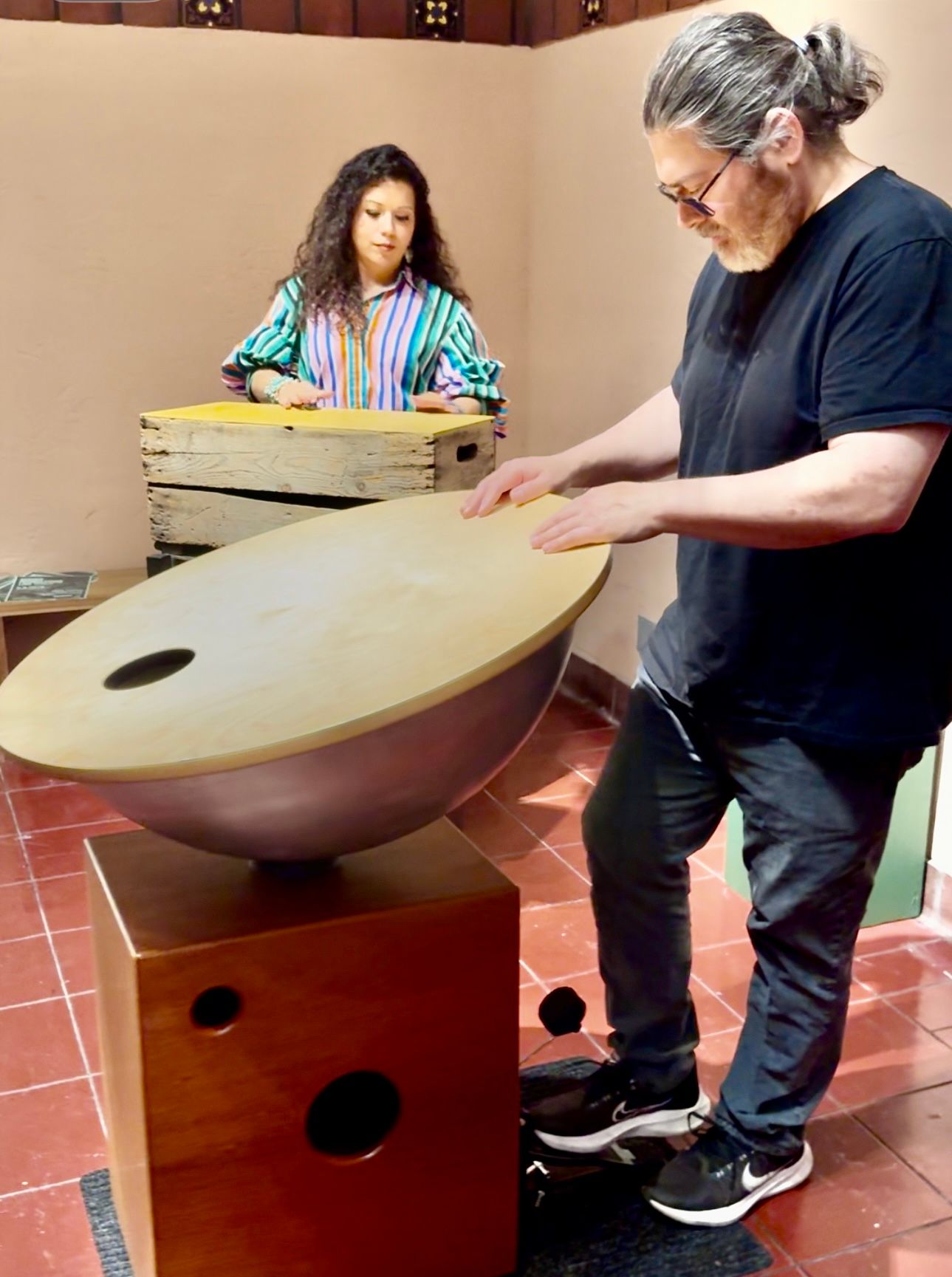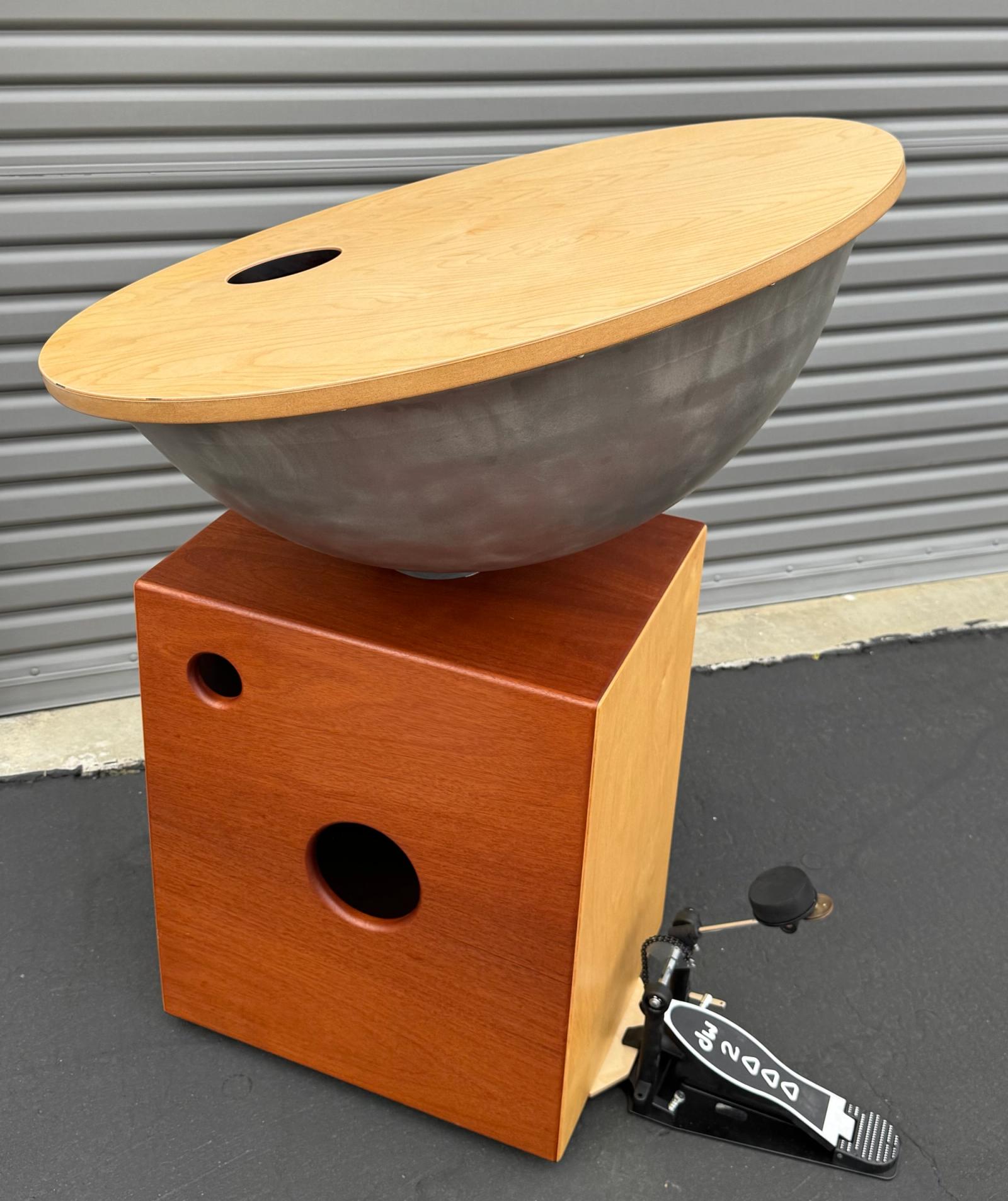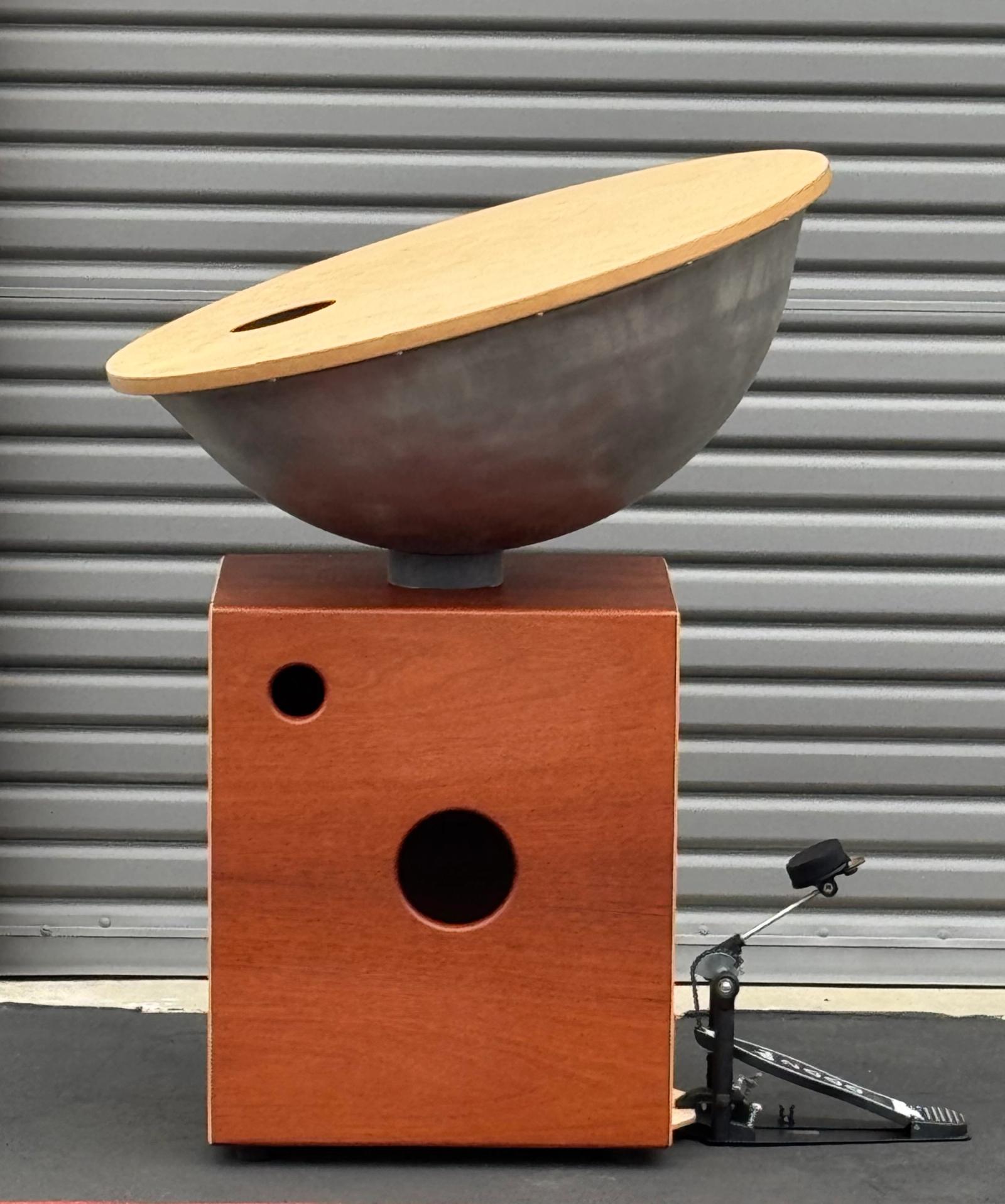 This unique cajón originated from an oversized stainless steel mixing bowl, a gift from a friend who saw its potential as a musical instrument. I flattened the rim and attached a wooden hoop and tapa - the playing surface - transforming the bowl into a functional cajón. This version stands out with its significantly larger cajón base and oversized hoop and tapa. To play, the musician stands, hands striking the mounted cajón and foot working the pedal in a dynamic, rhythmic dance. Its distinctive half-moon shape inspired the name Luna Rumbera, a nod to the Afro-Cuban tradition of the cajón, where rhythm, movement, and culture unite in vibrant celebration.