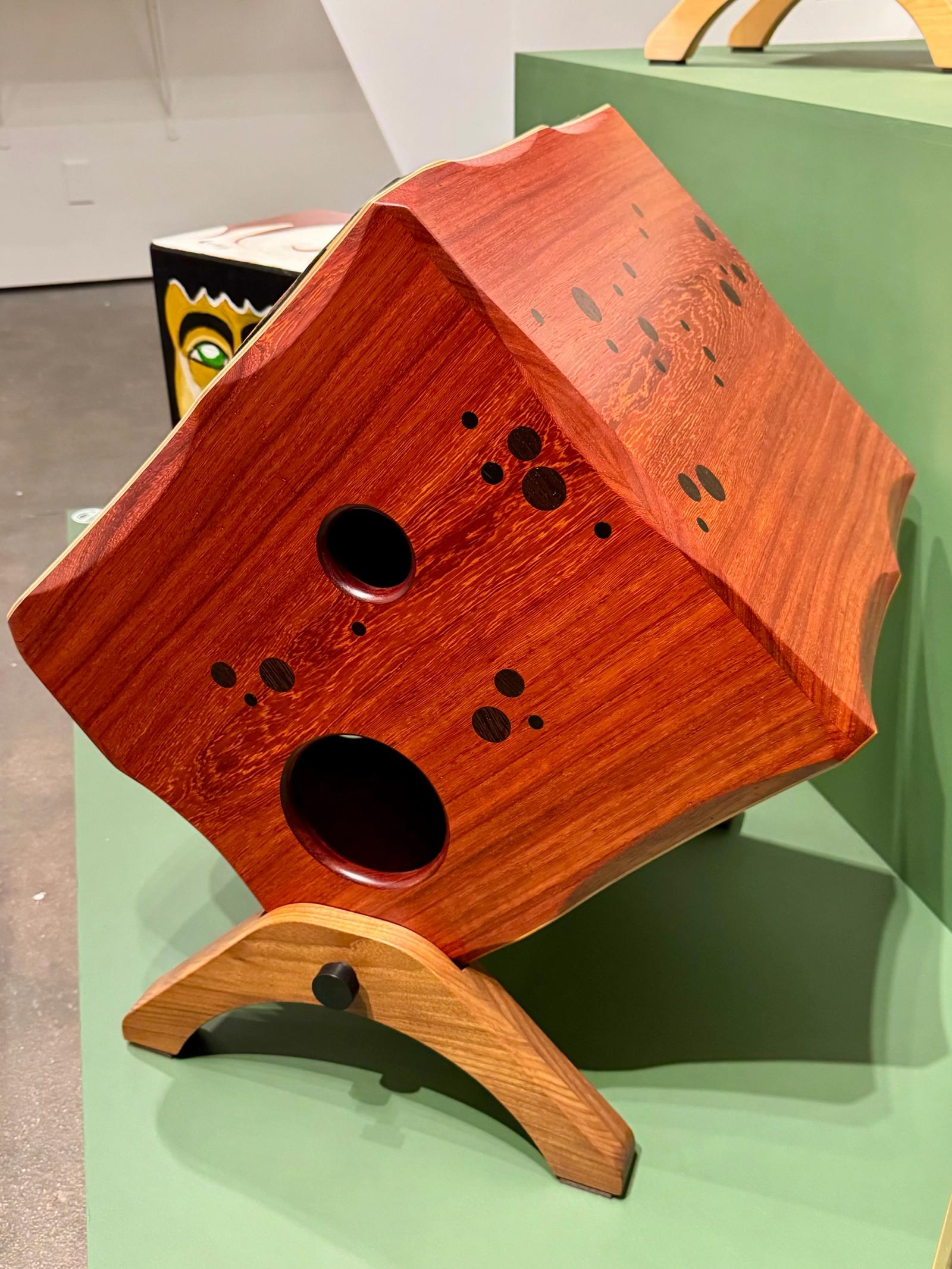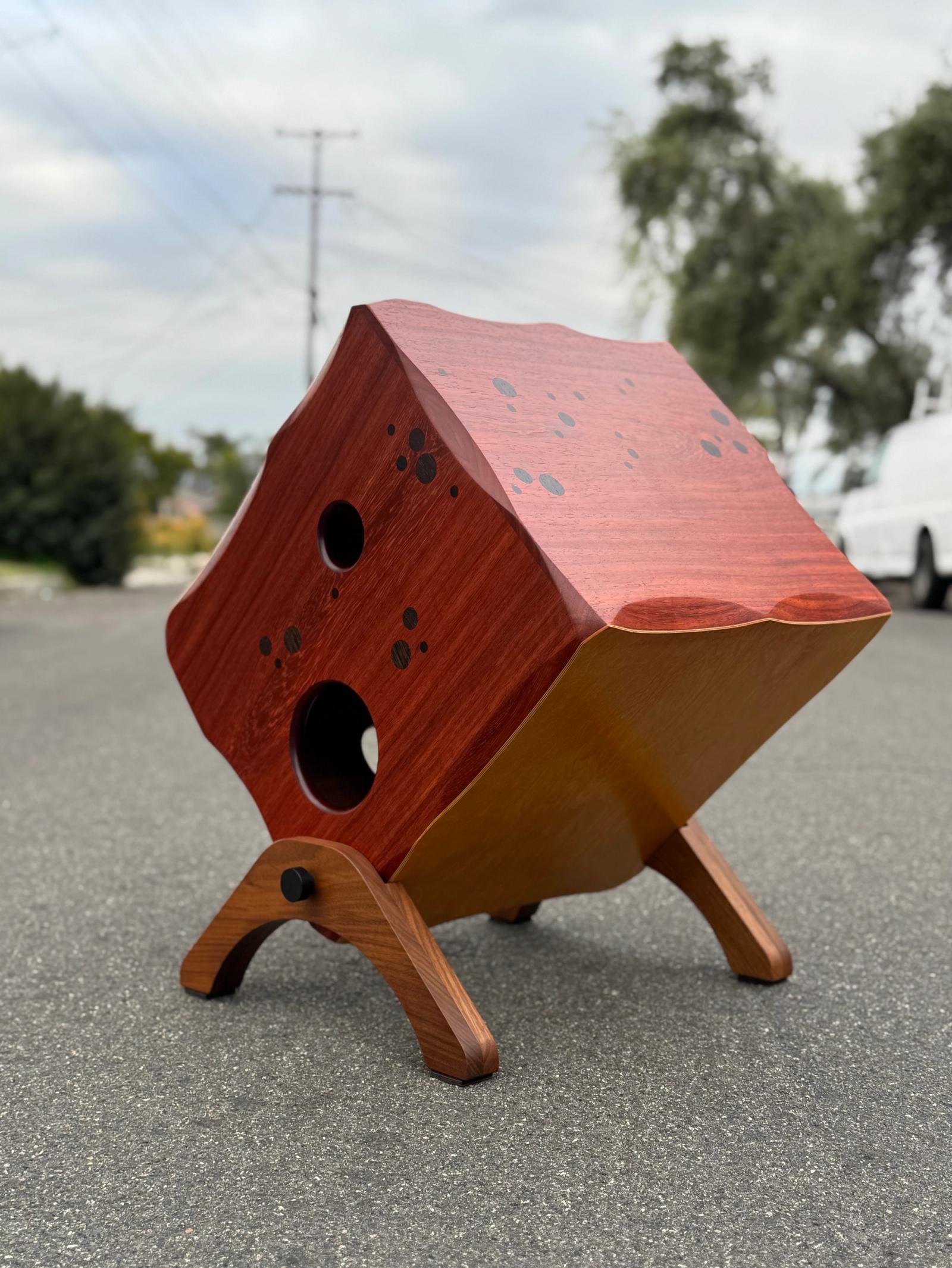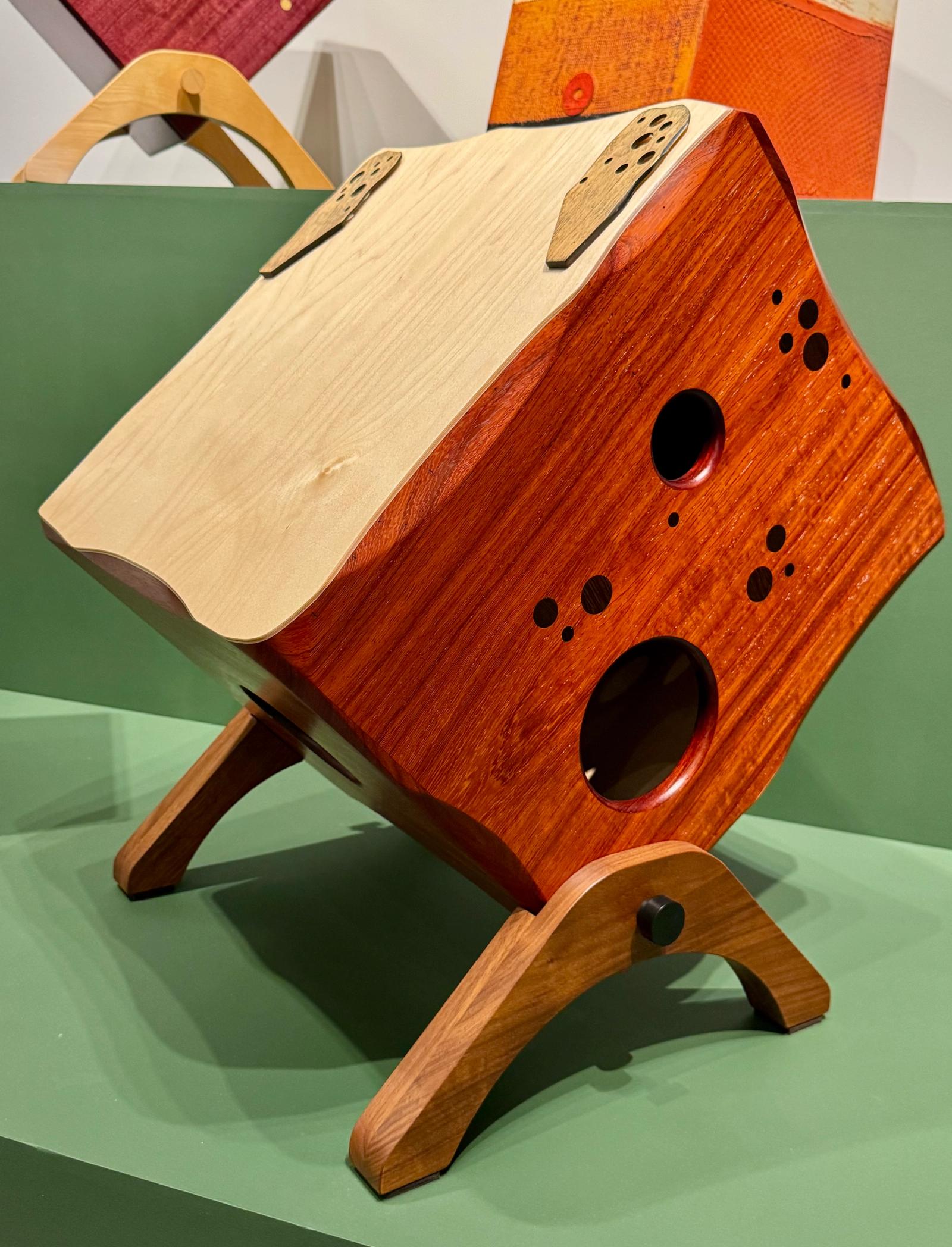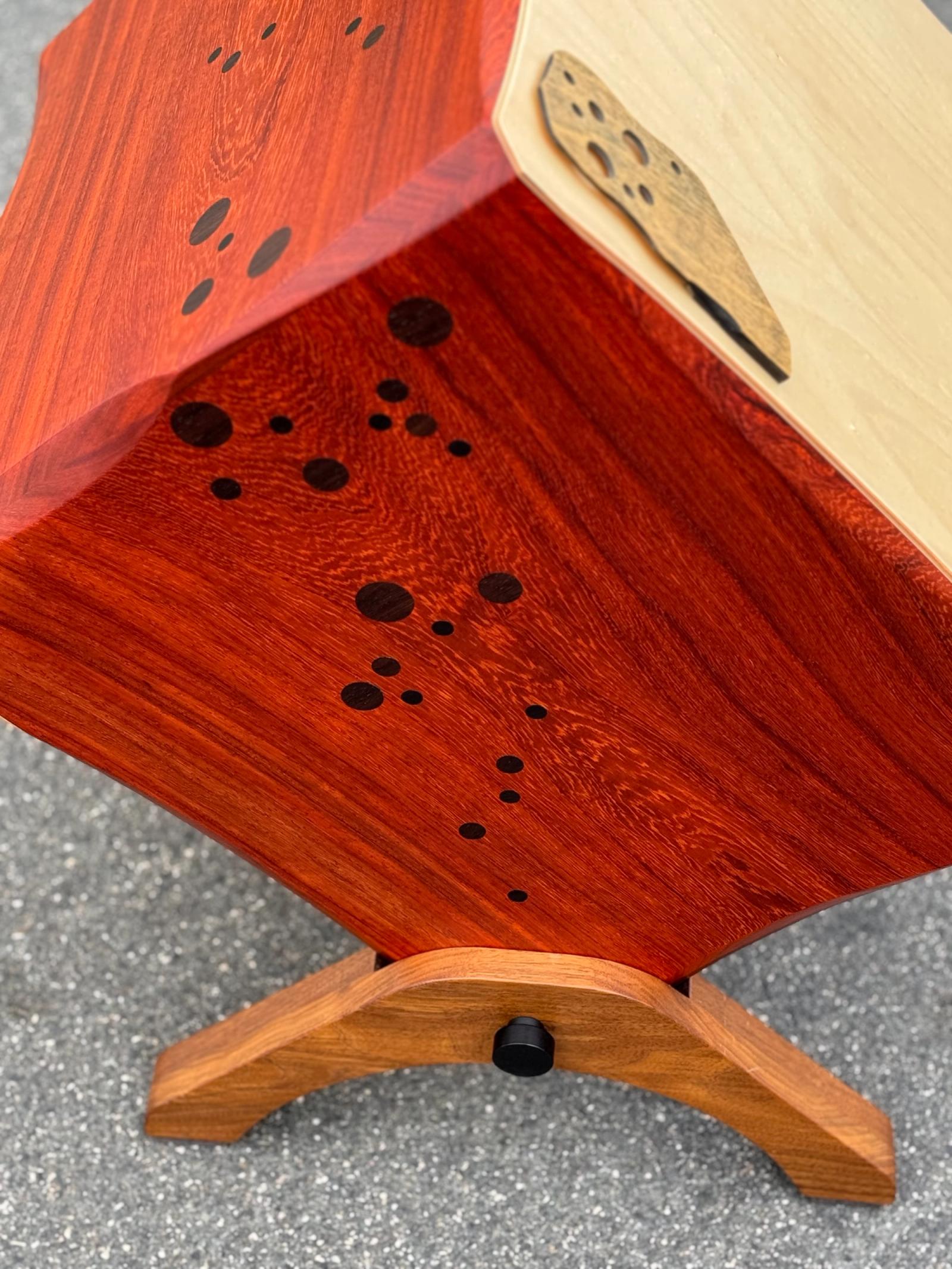 This large cajón is the result of a collaboration between Michael Kotzen and studio partner Kirk Delman. It is contstructed from Padauk, chosen for its excellent acoustic properties and striking orange hue. Kirk, a sculptor and furniture maker, contributed precisely executed Wenge inlays and sculpted edges that enhance both form and function. Integrated legs elevate the instrument, enabling playing from an external seat and enhancing projection. The cajón delivers exceptionally deep, resonant bass tones with clear articulation across the frequency range. A pair of Kotz Slap Pads provides additional contrasting accent tones.