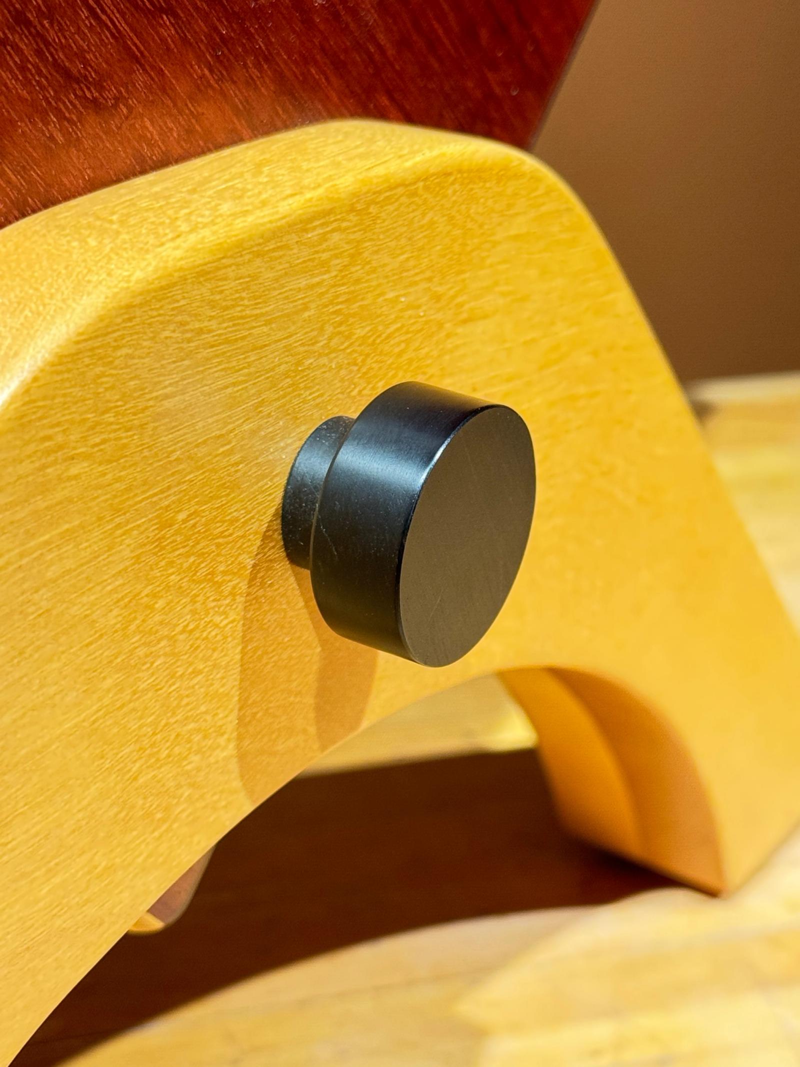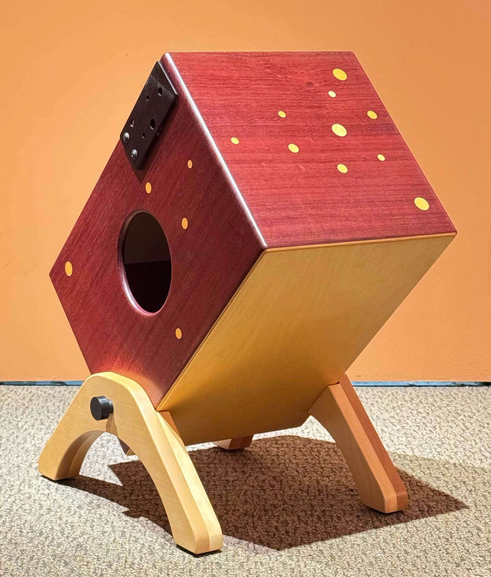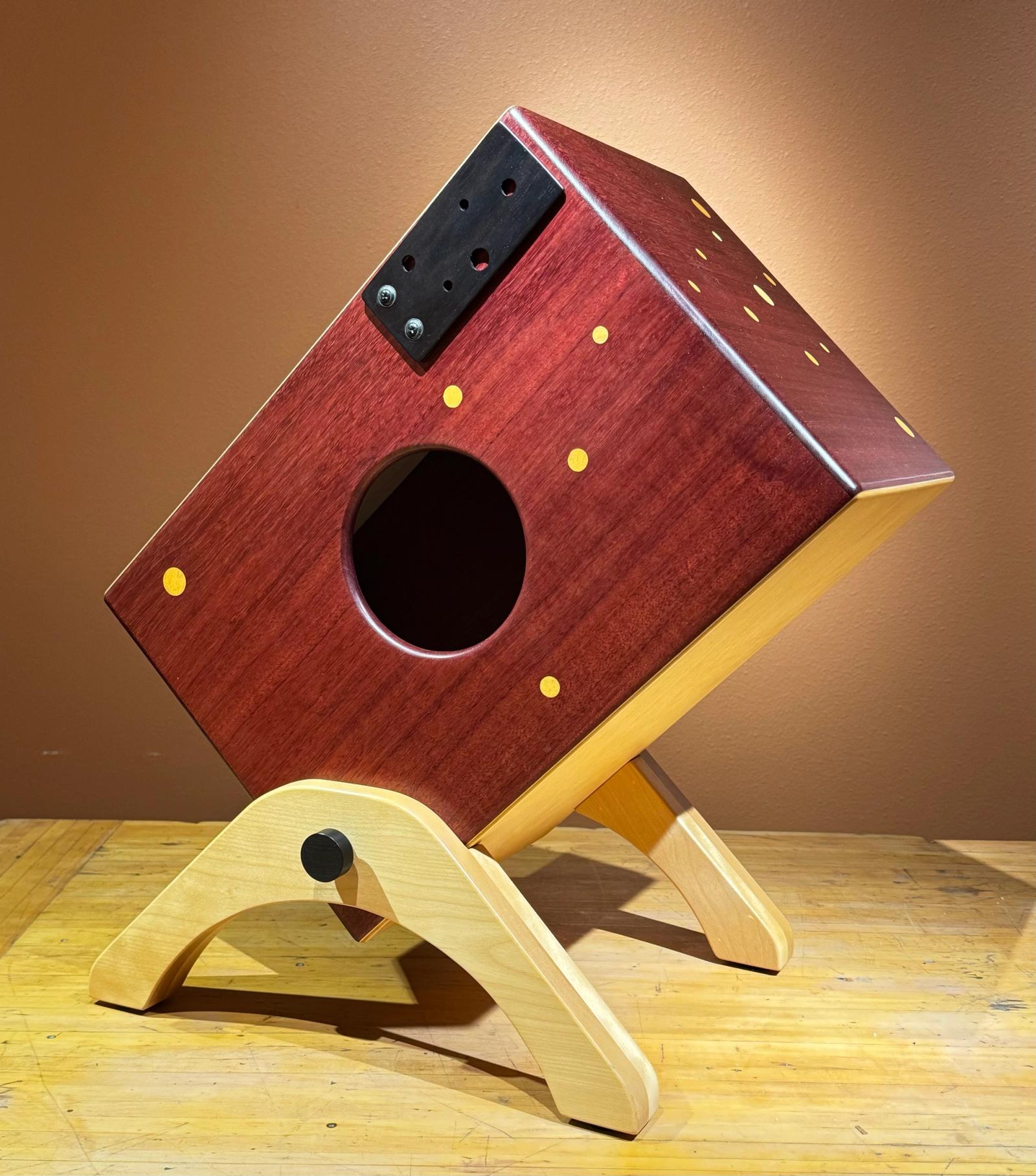 This cajón is the result of an ongoing creative dialogue between myself and studio partner, Kirk Delman, whose creative vision shines with the Yellowheart inlays set into the Purpleheart and playfully reshaped Ebony slap pads. The playing surface, of book-matched quilted maple, evolved through iterations to deliver both visual harmony and deep, resonant sound. A hand-rubbed finish enhances the wood’s pure tones, free of stains or colorants. Integrated legs elevate the instrument, enabling playing from an external seat/ drum throne.