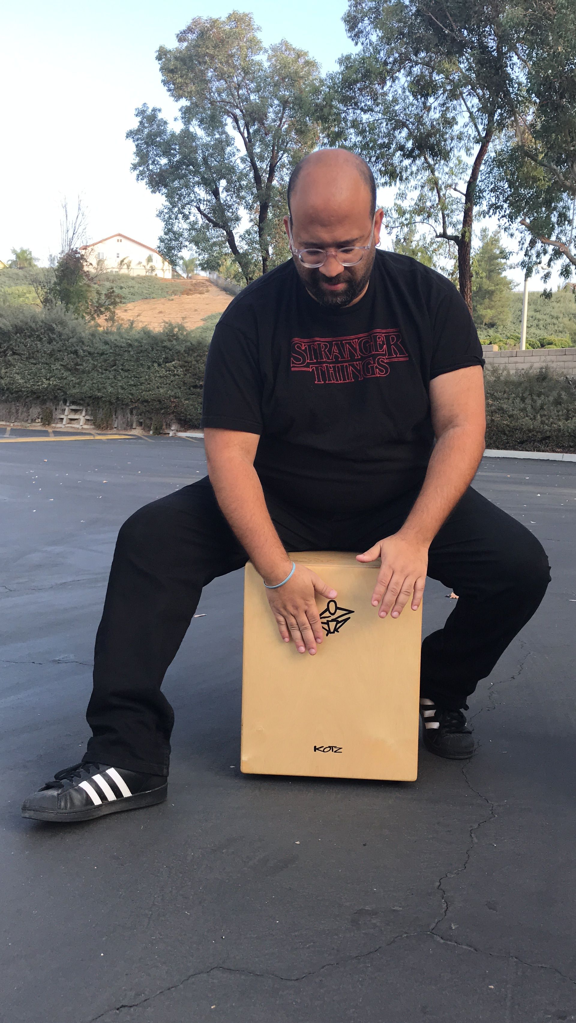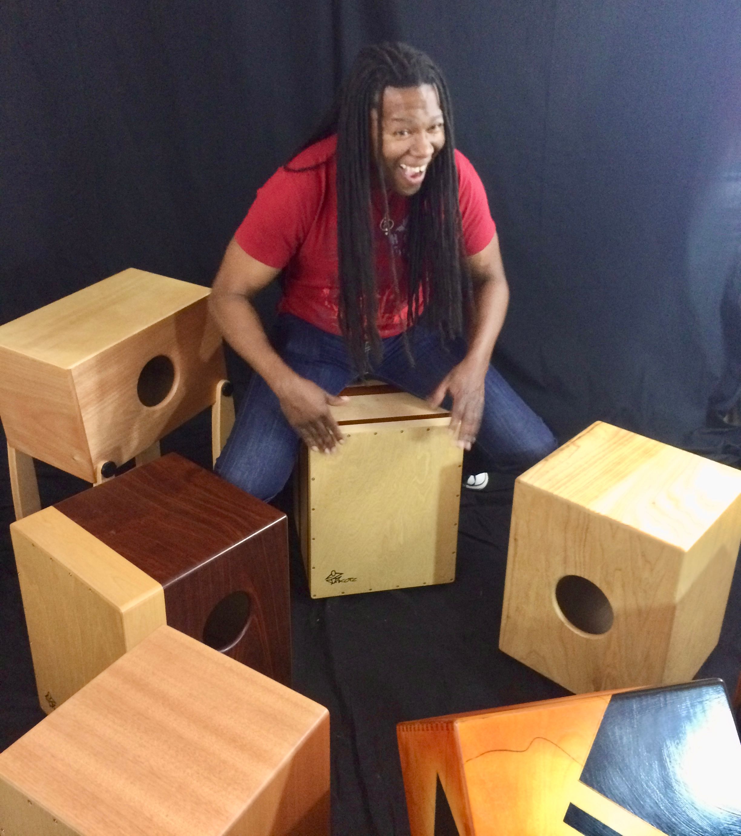 Playing his custom Kotz cajón in Pasadena.